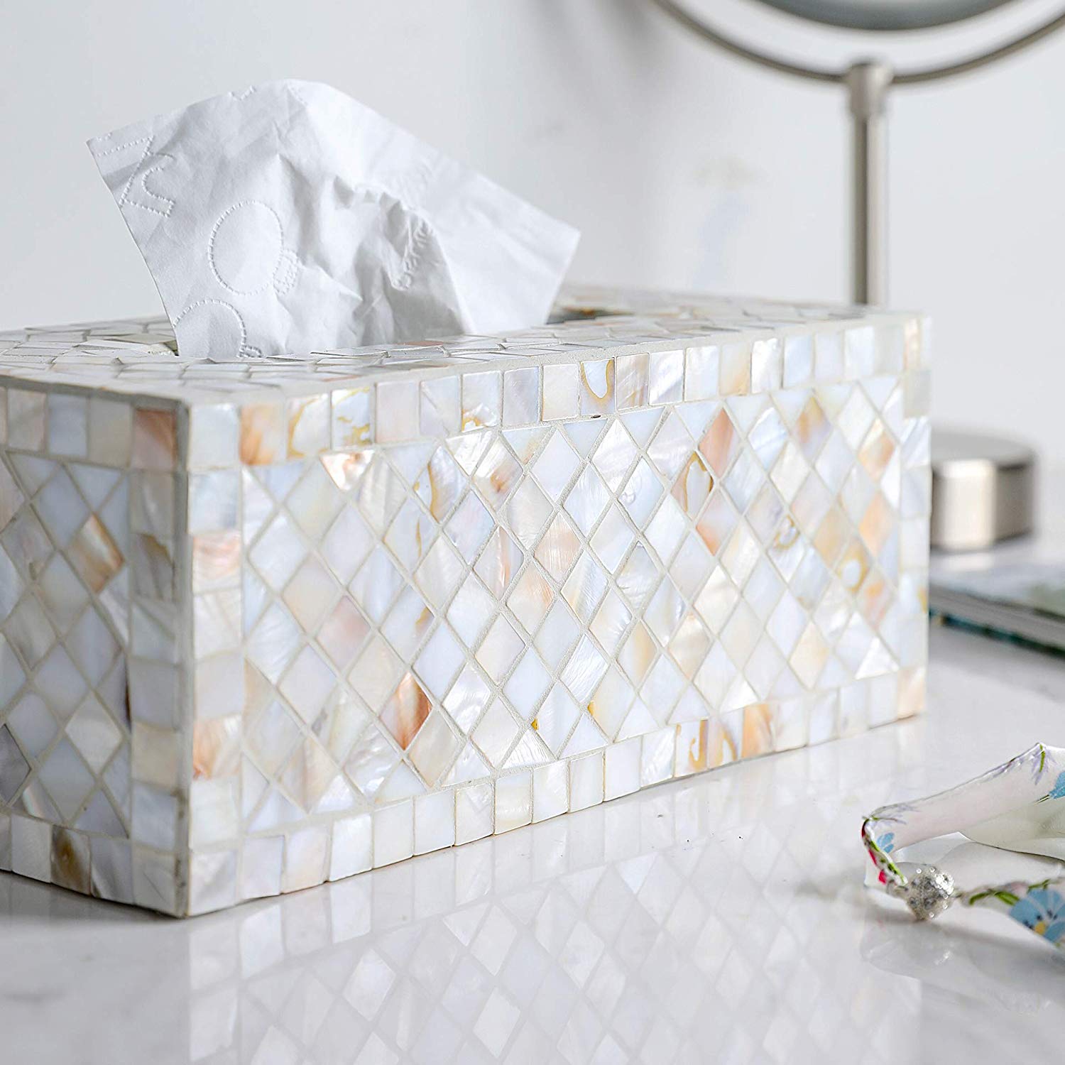 The light shell mosaic surface reflects soft light, offering a calm and refreshing aesthetic suitable for spa-style bathrooms and coastal décor themes.