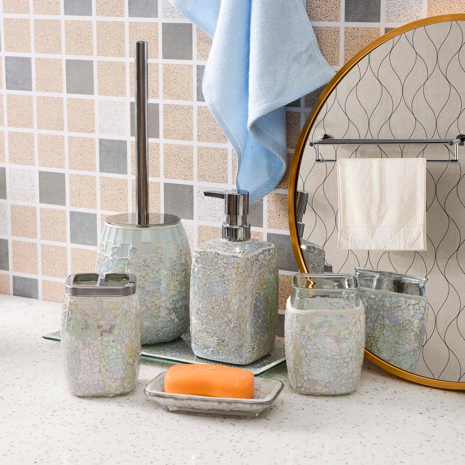 This Pearl White Glass Mosaic Bathroom Accessory Set features a fresh, elegant color palette combined with handcrafted mosaic glass craftsmanship. Designed for modern, coastal, and spa-inspired interiors, this coordinated set offers both decorative appeal and practical daily use, making it ideal for wholesale, private label, and hospitality projects.