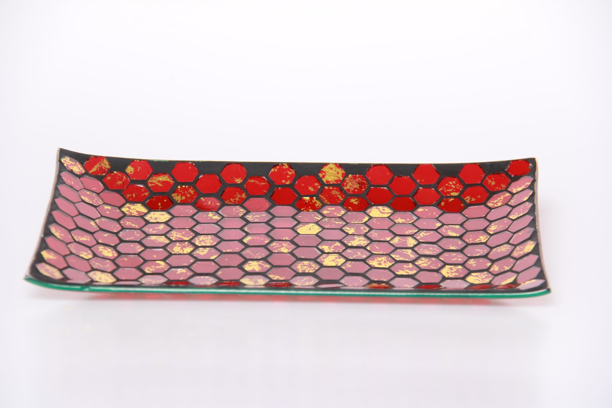 Each piece is individually handcrafted using traditional glass mosaic techniques. The layered red gold glass tiles reflect light beautifully, giving depth and visual interest to every item.