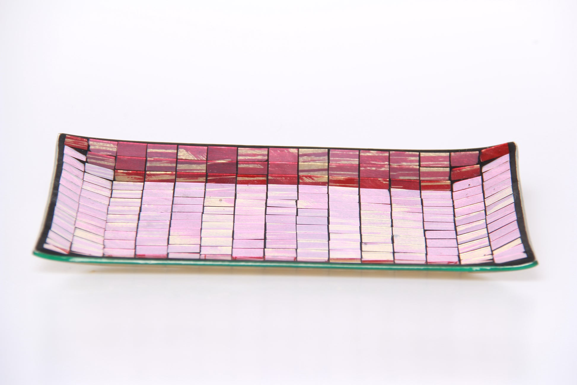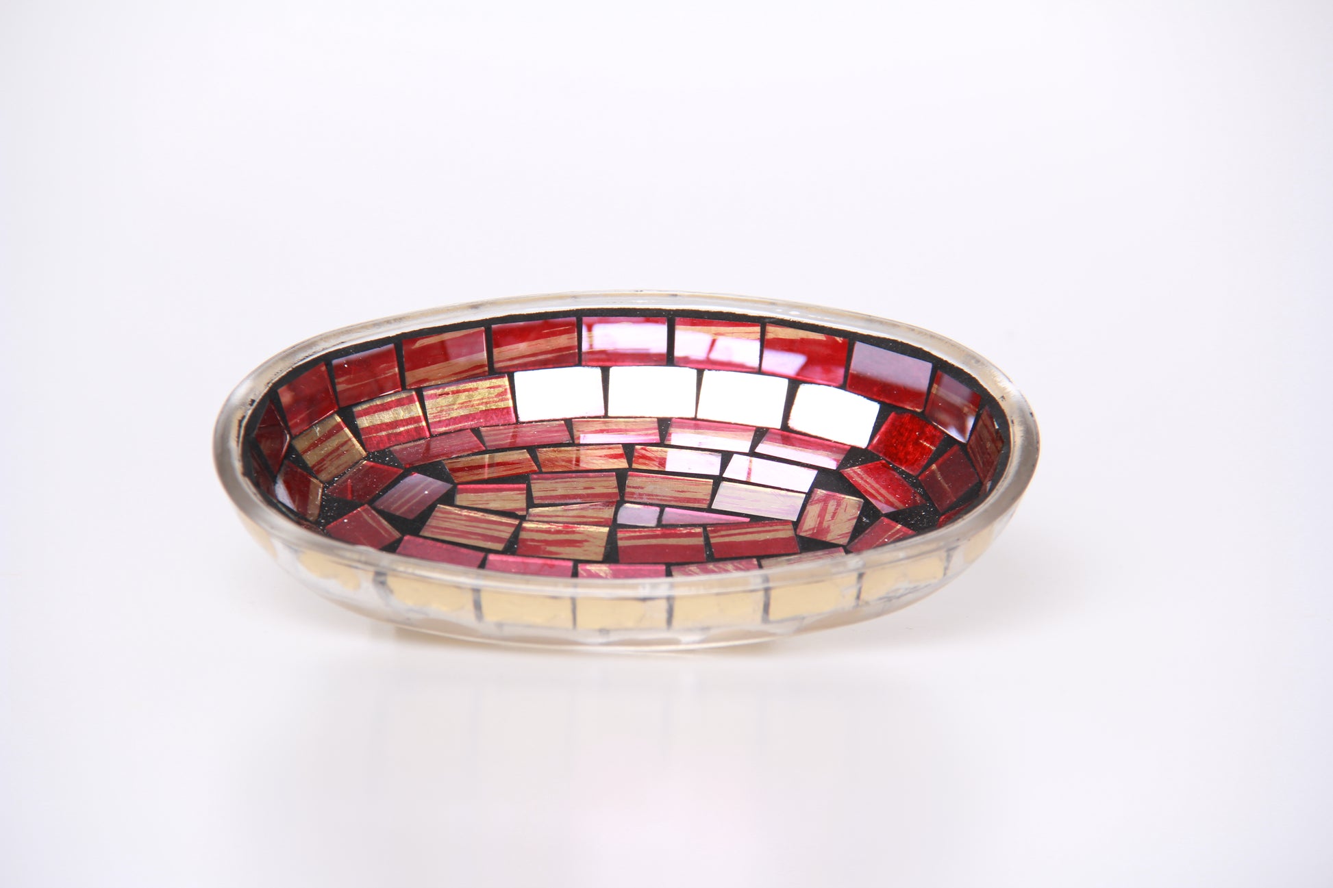 Each piece is individually handcrafted using traditional glass mosaic techniques. The layered red glass tiles reflect light beautifully, giving depth and visual interest to every item.