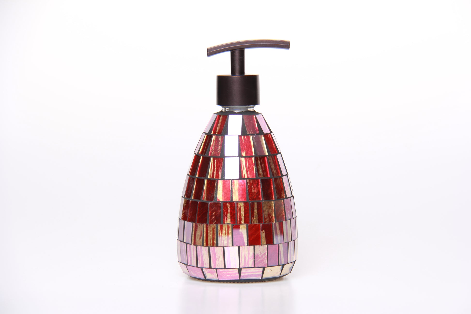 Suitable for liquid soap, lotion, or sanitizer. Commonly searched as red glass mosaic soap dispenser and decorative bathroom pump bottle.